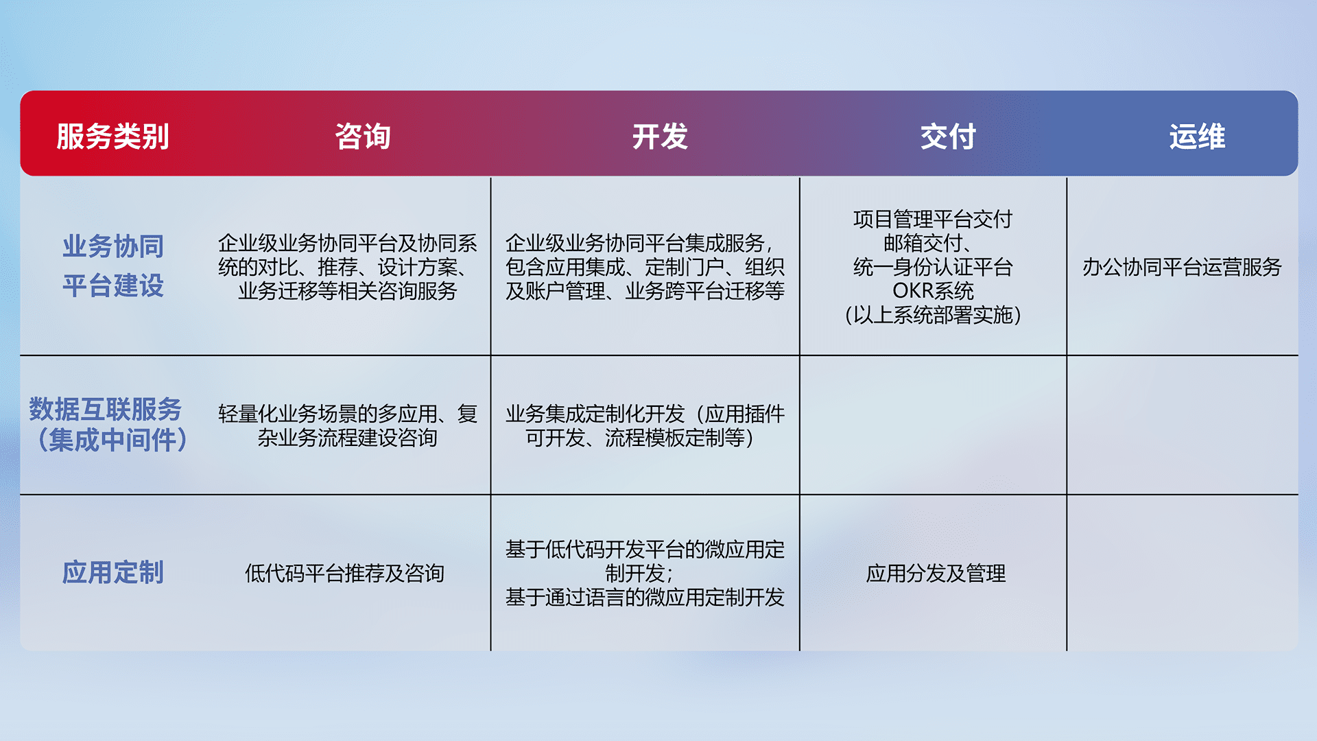 针对钉钉、、、企微、、、、IDaas等平台级产品提供产品的规划、、、、方案、、、交付、、、、定制化开发等服务,,实现如统一协同办公、、、、智能客户服务、、混合会议管理、、、、智能数据查询、、、等业务场景,,实现数字化转型。。。