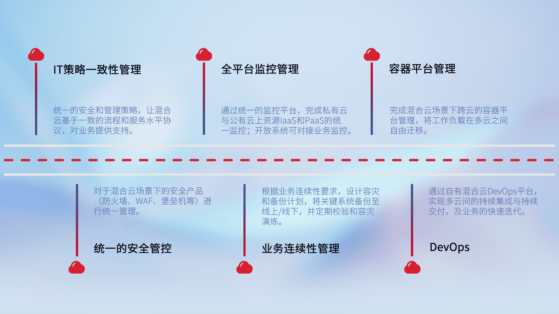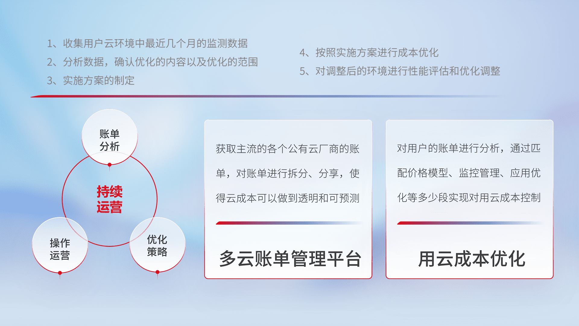 通过多云纳管,,以统一的资源数据模型把客户的云资源进行抽象和封装,,,进而实现对多云资源的统一操作,,保障云资源管理的可靠性、、稳定性与可用性。。。量身定制化运维内容,,,,配置、、、开发运维、、补丁管理、、备份、、、监控、、、、认证和访问管理、、、、审计和日常巡检等,,,保障在用云过程中的可靠度,,,稳定度以及高可用率。。。