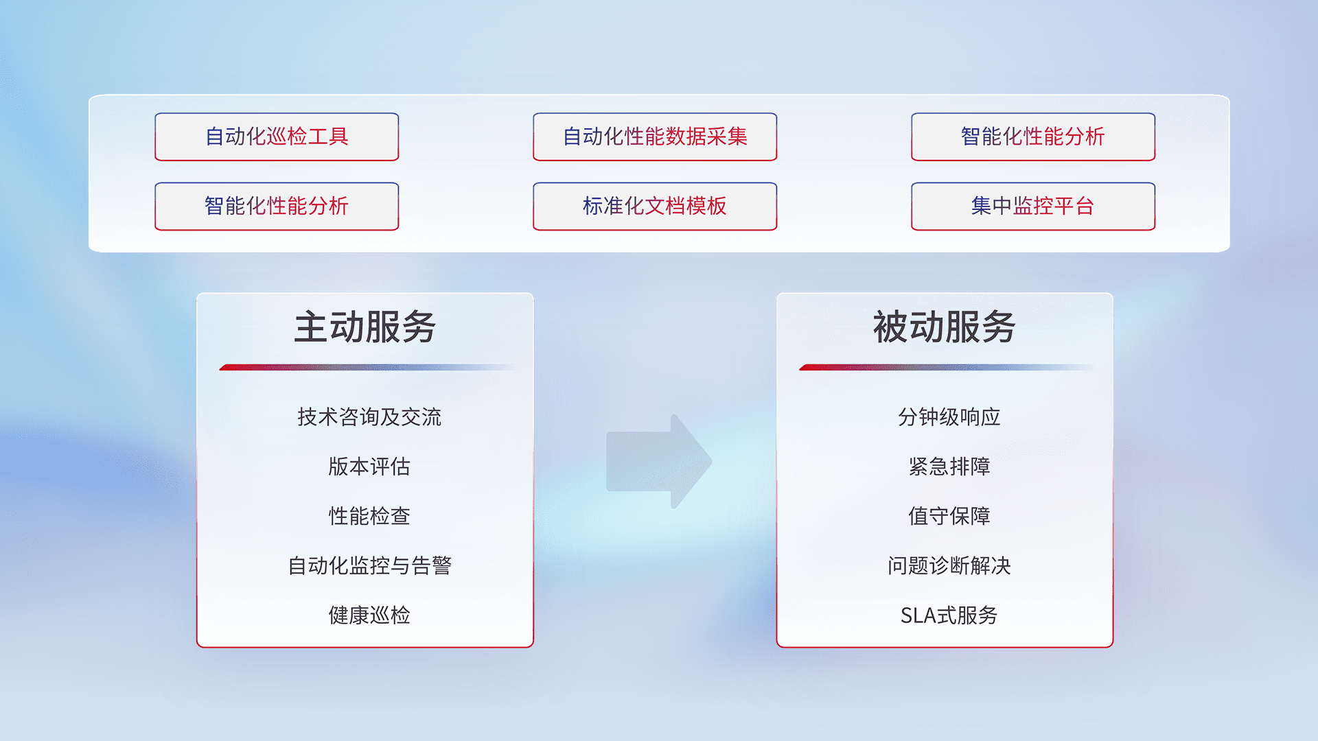 智能化工具和标准化文档,,,,保障服务质量,,,提供主动服务(包含技术咨询、、版本评估、、、性能检查、、自动化监控与告警、、、健康巡检)和被动服务包含(分钟级响应、、紧急排障、、、值守保障、、问题诊断解决、、、SLA服务)。。。。
